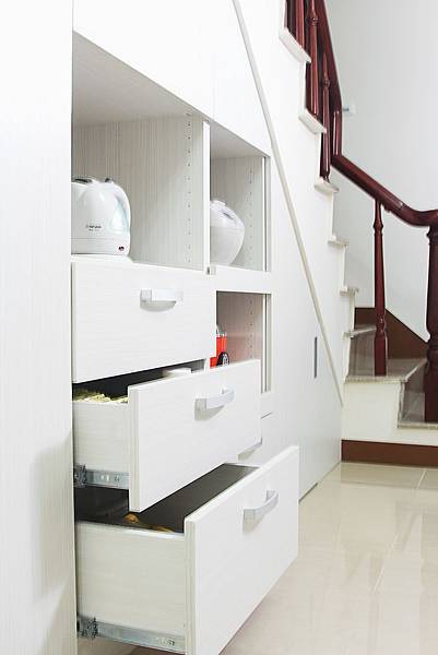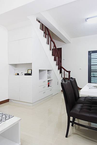 一樓的部分,是現在常見的格局,和業主討論後,了解業主希望有電器櫃也有餐桌,所以設計師在樓梯下做了電器櫃,完全展現出我們公司系統客製化的優勢。![]()