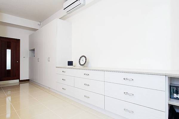 這次的設計,設計師和業主做討論,得知業主希望不要使用到木作,又希望收納量夠多,該有的生活機能都要有,所以設計師使用了全系統的方式下去處理。![]()