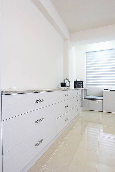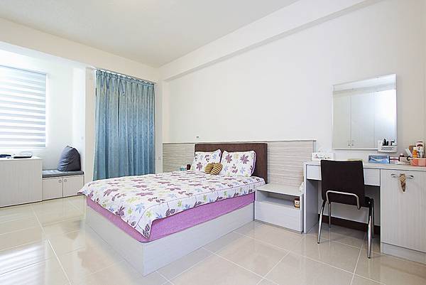 主臥床頭背牆,設計師用系統做了一個床頭背牆,可以閃避樑,讓頭不要睡在樑下;在床邊設計師一樣設計了一個化妝台讓女主人擁有自己的化妝空間,旁邊則是設計了一個側拉可以擺放女主人的保養品![]()